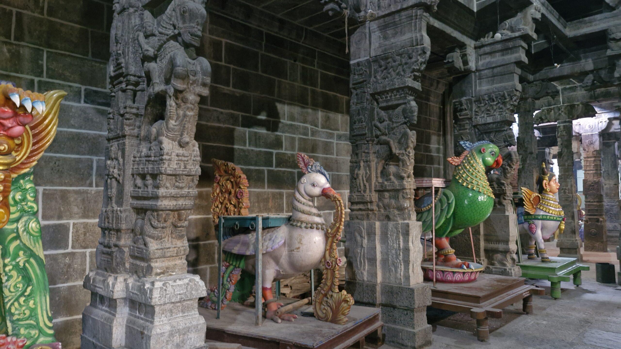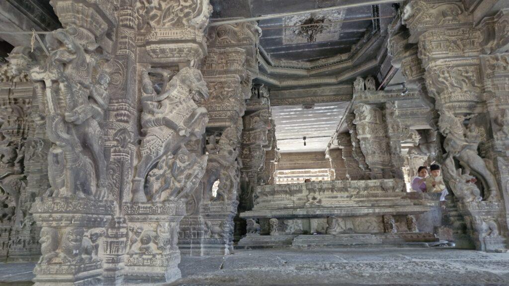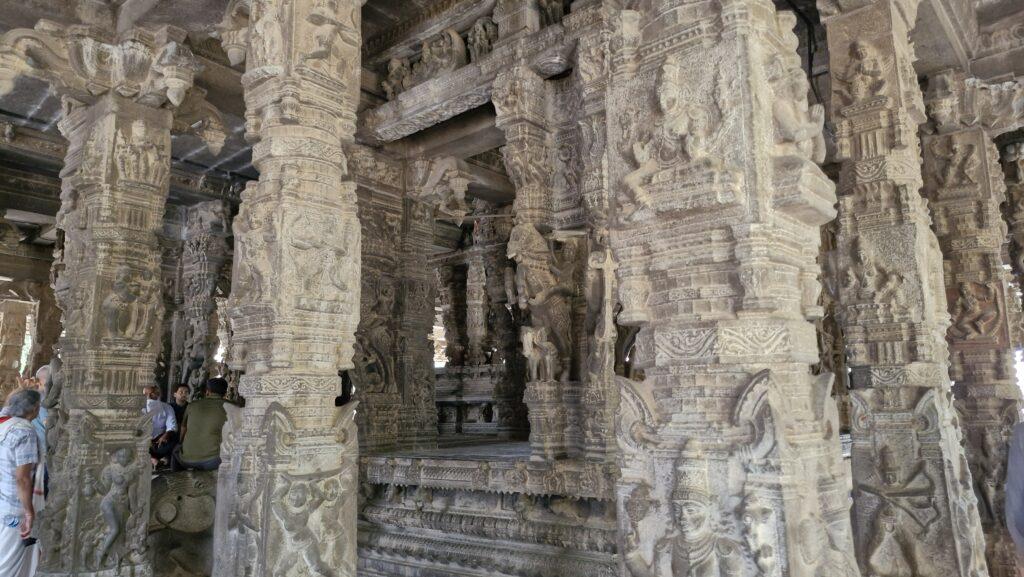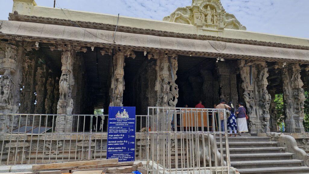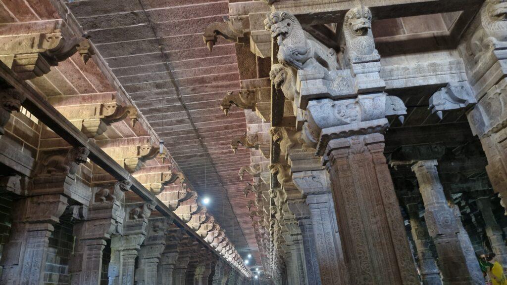 Il est d’ailleurs particulièrement réputé pour le mandapam de la première cour aux somptueuses sculptures accessible à tous. Considéré comme un musée, on accède à ce hall aux 1000 colonnes moyennant un paiement. Les piliers Yalis attestant de l’intervention des Vijayanagars. Communs dans le Sud de l’Inde, ils représentent des créatures mythiques, aux têtes d’éléphants ou de cheval mais aux corps léonins. Leur puissance protégeait les temples. Des sculptures illustrent le Ramayana et le Mahabharata dans cette salle magnifique, ouverte aux quatre vents.