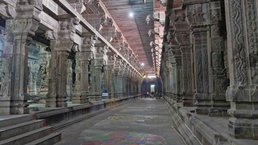 Puis vous pourrez longer l’immense corridor bordé de lingams. De magnifiques piliers sculptés de yalis attestent de la réfection du temple à l’époque de la dynastie Vijayanagar. De petits autels et des chariots et statues processionnels rangés mènent jusqu’à une courette dans laquelle survit un manguier soi-disant tri centenaire. L’on contourne ainsi le sanctuaire. Une véritable plongée dans l’atmosphère sacrée et de l’immensité du lieu.