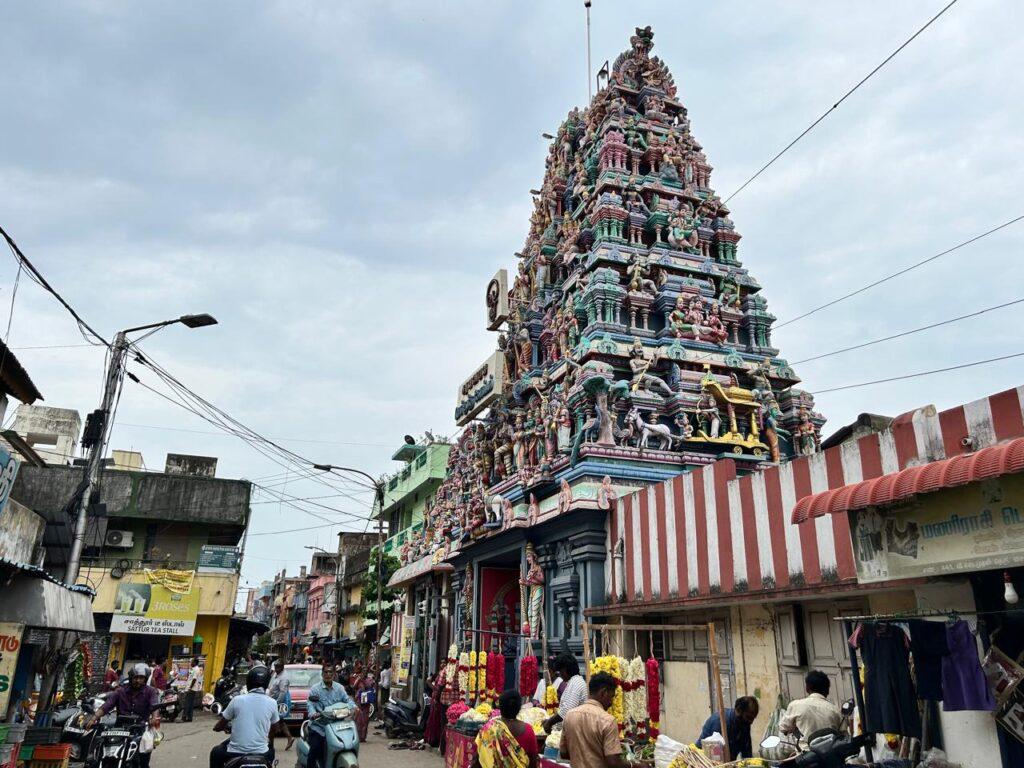 Dédié à Karaneeswara – Shiva ( celui qui est à l’origine) il réplique un petit temple médiéval de Mylapore. Ici on l’associe à Swamambika (la déesse de prospérité- autre nom de Parvati). De ce fait, le temple symbolise bien être et prospérité. C’est aussi le lieu de culte privilégié des chauffeurs en détresse qui viennent y faire bénir leurs clés pour éviter les accidents. Avec le temple du « garde corps », dans le quartier de la gare, il est donc le lieu d’une exaltation religieuse toute particulière.