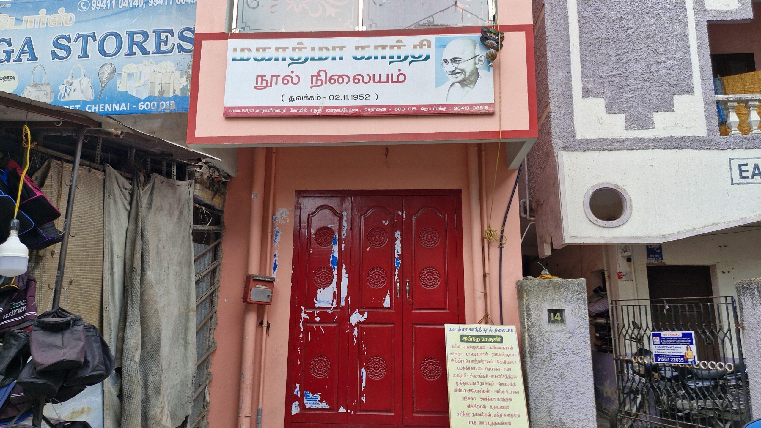 On remonte une nouvelle fois le long de la très jolie gare Art deco de Saidapet. Un peu plus loin en face d’un autre petit temple coloré, une des rares maisons traditionnelles à pans de bois disparait peu à peu dans la marée alentour de cubes colorés et peu harmonieux. Juste à côté, une porte rouge s’ouvre sur la bibliothèque Mahatma Gandhi fondée en 1952. Bien que tous en Tamoul, les livres honorent la mémoire de la grande âme et des Freedom fighter qui ont combattu pour l’indépendance de l’Inde.