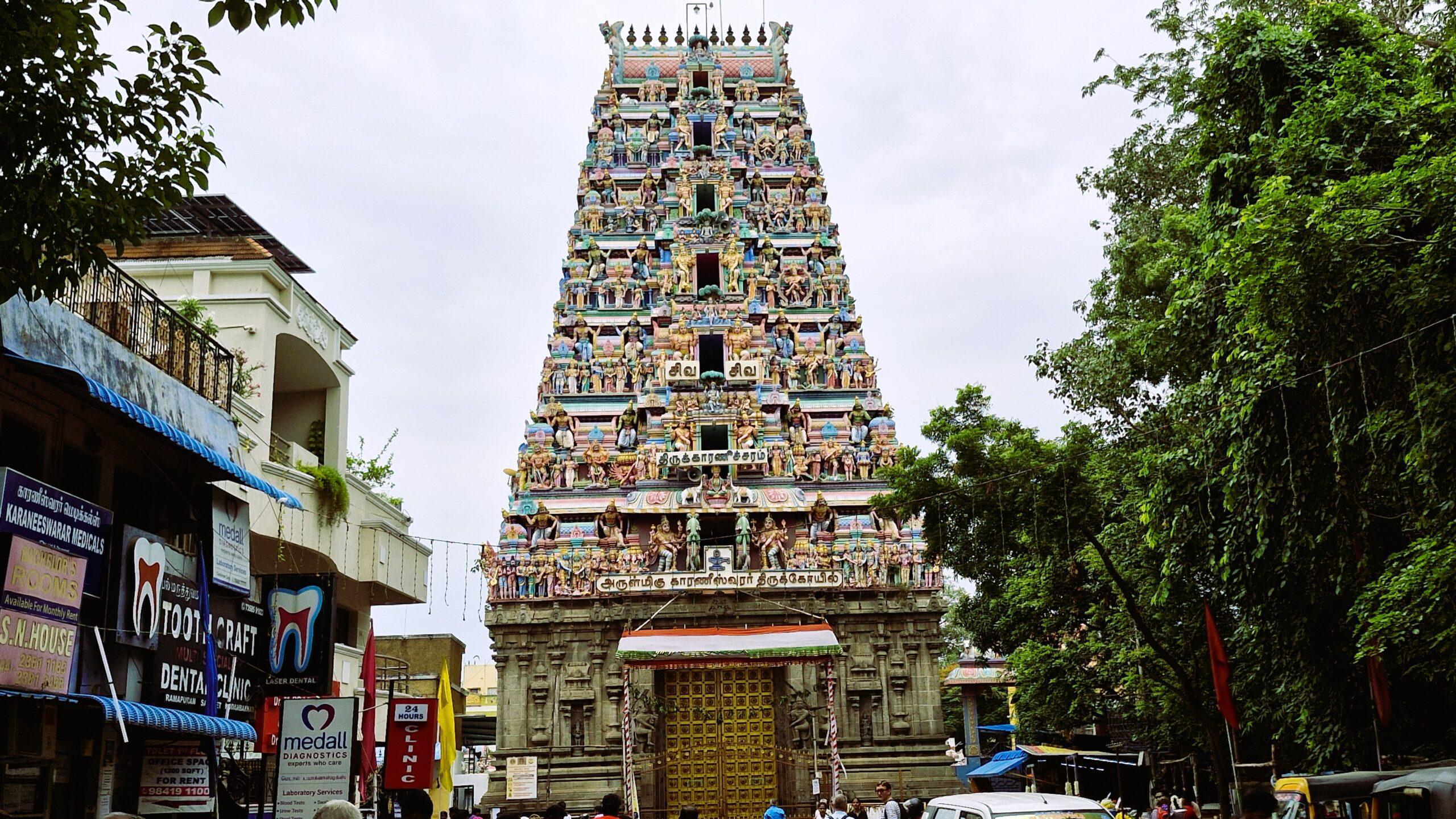 Dédié à Karaneeswara – Shiva ( celui qui est à l’origine) il réplique un petit temple médiéval de Mylapore. Ici on l’associe à Swamambika (la déesse de prospérité- autre nom de Parvati). De ce fait, le temple symbolise bien être et prospérité. C’est aussi le lieu de culte privilégié des chauffeurs en détresse qui viennent y faire bénir leurs clés pour éviter les accidents. Avec le temple du « garde corps », dans le quartier de la gare, il est donc le lieu d’une exaltation religieuse toute particulière.
